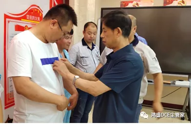 老黨員為新黨員佩戴黨徽,鼓勵年輕人不斷拼搏
